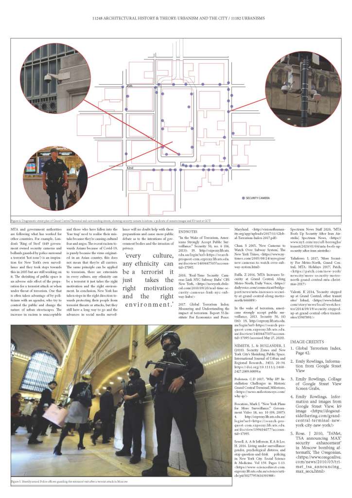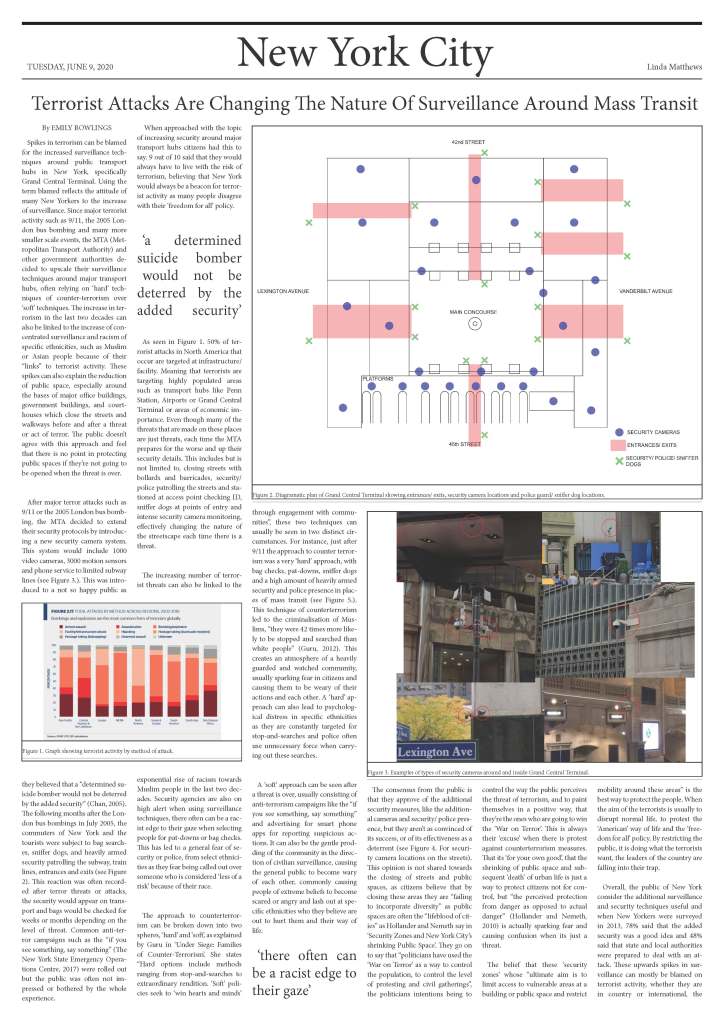 Assessment 2 required us to take our research from Assessment 1 and bring in the element of surveillance. By mapping the location of cameras in and around Grand Central Terminal and researching surveillance techniques before terrorist attacks I was able to evaluate how the increase of surveillance effected mass transit and the surrounding city. These spikes in terrorism can also explain the reduction of public space, especially around the bases of major office buildings, government buildings, and courthouses. Security agencies are also on high alert when using surveillance techniques, there often can be a racist edge to their gaze when selecting people for pat-downs or bag checks. Hence the increase of survaillence around mass transit has a negative impact on the public and creates hesitation when introducing new public space into a city for fear of terror attacks.
