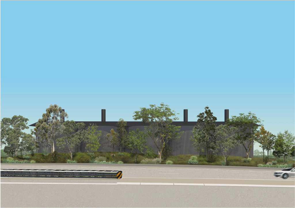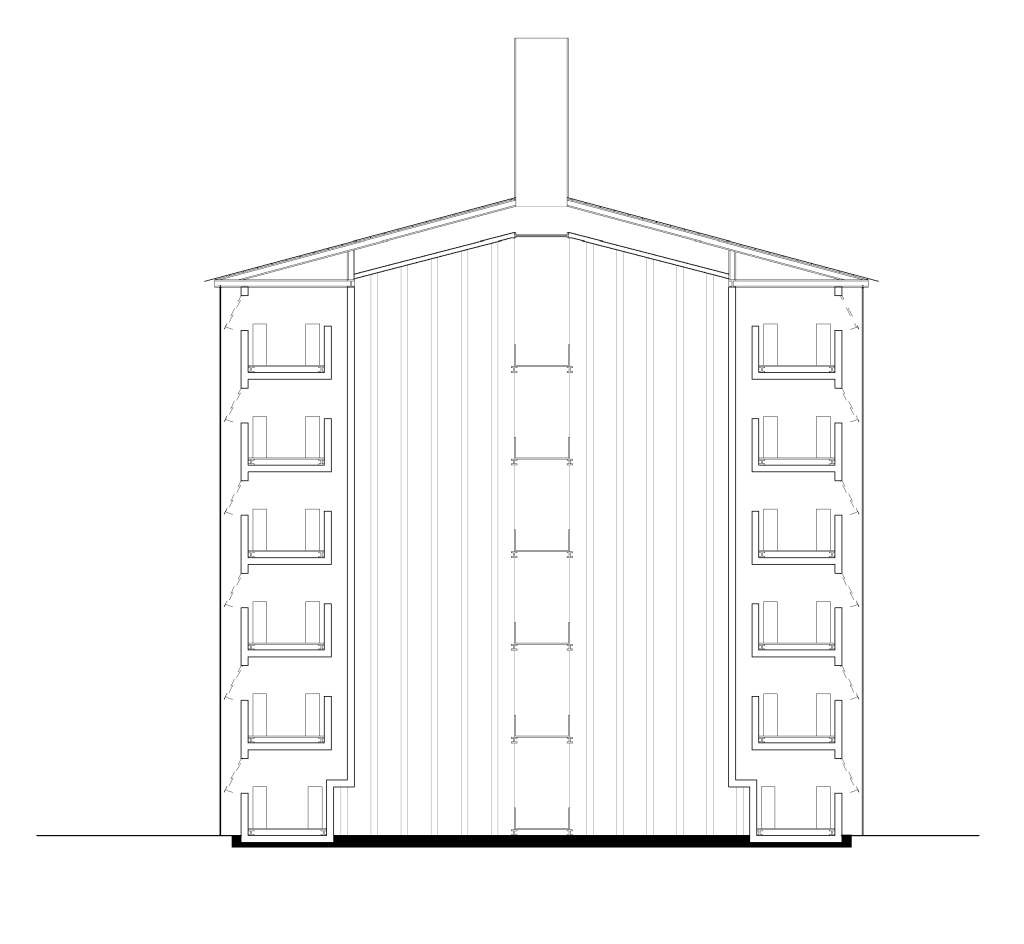 Data centres are known for being hard to cool down, and with a site such as Bella Vista, the Australian sun was a large concern. Not only was the circular form taken as inspiration from the CLUMEQ center, but also how they implemented a thermal stack strategy to enable passive cooling. The internal structural wall creates a central void, allowing for a chimney stack effect to take place. All data racks sit on an elevated steel grate enabling a cavity between them and the floor, for accessibility and passive cooling. The cool air that enters the space through the awning windows moves within the cavity, picking up any heat radiated from the racks. As hot air rises it is pulled out of the area through a gap in the internal wall via a difference in pressure created by the heating of the chinmy wall. The air then rises and continues the cycle by further heating the chimney and increasing the pressure difference, therefore resulting in the hot air being pushed up out of the central chimney. A Woodland grey colorbond roof caps the silos and wraps the chimneys. Its colour and materiality further drives the thermal chimney effect, by creating the draw of hot air up and out the 7m chimney.