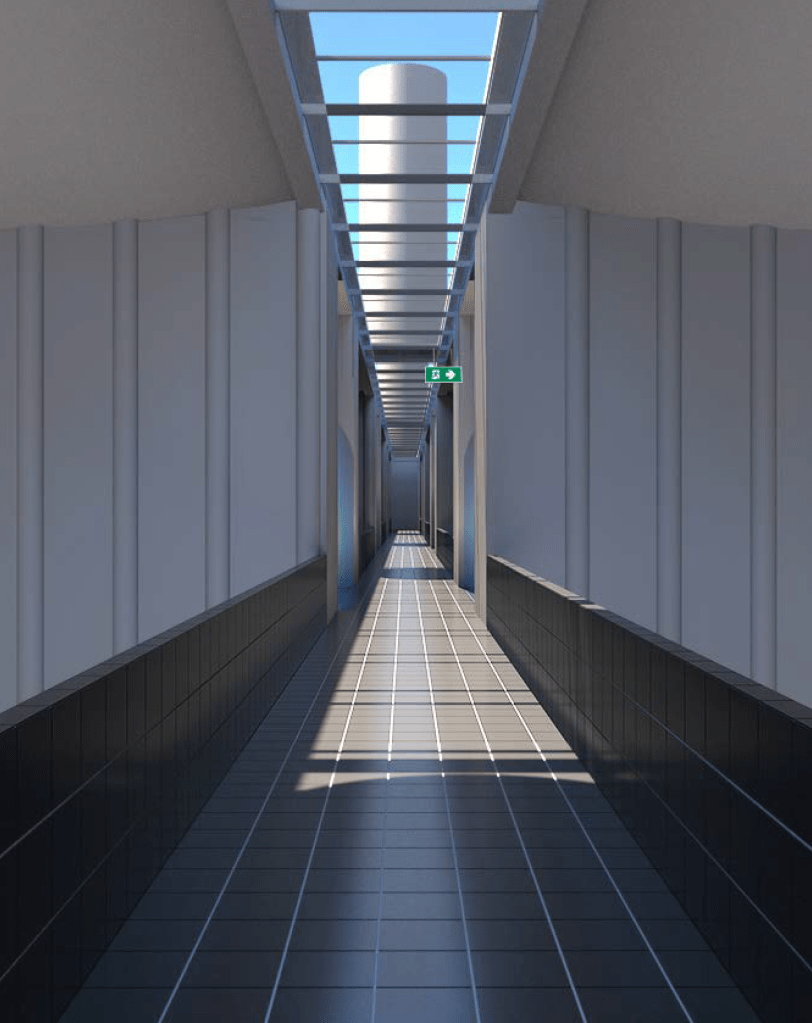 DataCentric Silos is constructed from reinforced concrete, the thermal stack effect required a chimney space therefore, we included a double ceiling design which has a double glass skylight along the apex of the roof to draw light into the void and walkway. The walls of the void have columns, these pieces are structural but also create a small moment of monumentality as the slim tiled walkway pulls you across you’re confronted with a wall of textured concrete and you get the sense that the building is standing there with just brute force.