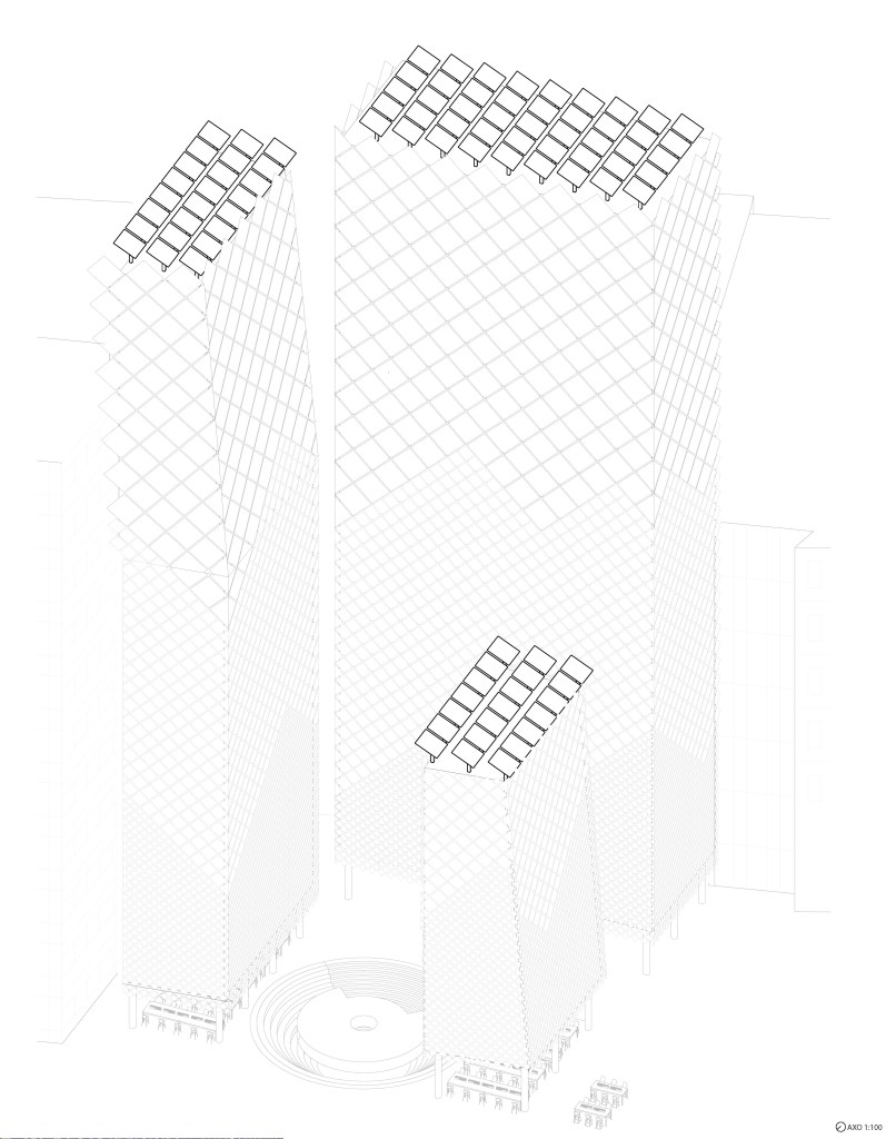 Protosolar was designed to be a beacon of renewable energy, using its unique solar facade to become a renewable energy hub. The accommodation blocks of Protosolar have been sculpted and orientated to maximise the opportunity for solar collection, the solar facade of each block becoming an integral part of their architecture. Removing the need for energy providers, Protosolar delivers power straight through the grid to those utilising its peer-to-peer trading system. This allows for customers to have faith that Protosolar is a 100% renewable resource, whereas other distributors or power plants may be involved in fossil fuel companies. Using a peer-to-peer solar trading system, Protosolar will become an energy network, sustaining the local environmentally conscious community. By creating a renewable energy network, this removes the potential connection to any fossil fuels, by removing the connection from companies that have involvement in non-renewable resources. Utilising this grid system to foster a new type of community, centred around sustainable living, Protosolar engages the public through its interactive charging hotspots and learning centre. Customers who are interested in being part of our renewable energy network, will become connected through an app that allows them to choose where they draw their power from. This allows the public to have an active role in deciding what kind of power they’re receiving, and with Protosolar being a landmark in this field, the public are able to physically see where their power comes from rather than relying on the promise of a billion dollar company. With Protosolar, we hope to influence a new interest in renewable energy, specifically Solar in Australia with the extreme summer conditions.