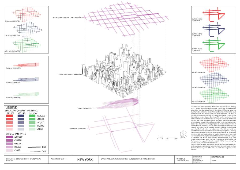 Assessment 1 required us as a group to map a 1km square of New York City. We chose the area around Grand Central Terminal to better understand how this once bustling center of trade and goods became the tourist hot-spot and shopping precinct it is now know as. Through research of roads, trade routes, and public transport we created a map that details commuter statistics into the Manhattan borough. Which as we discovered displays that over time the Grand Central Terminal was downgraded to the tourist hub rather than the commuter hub.