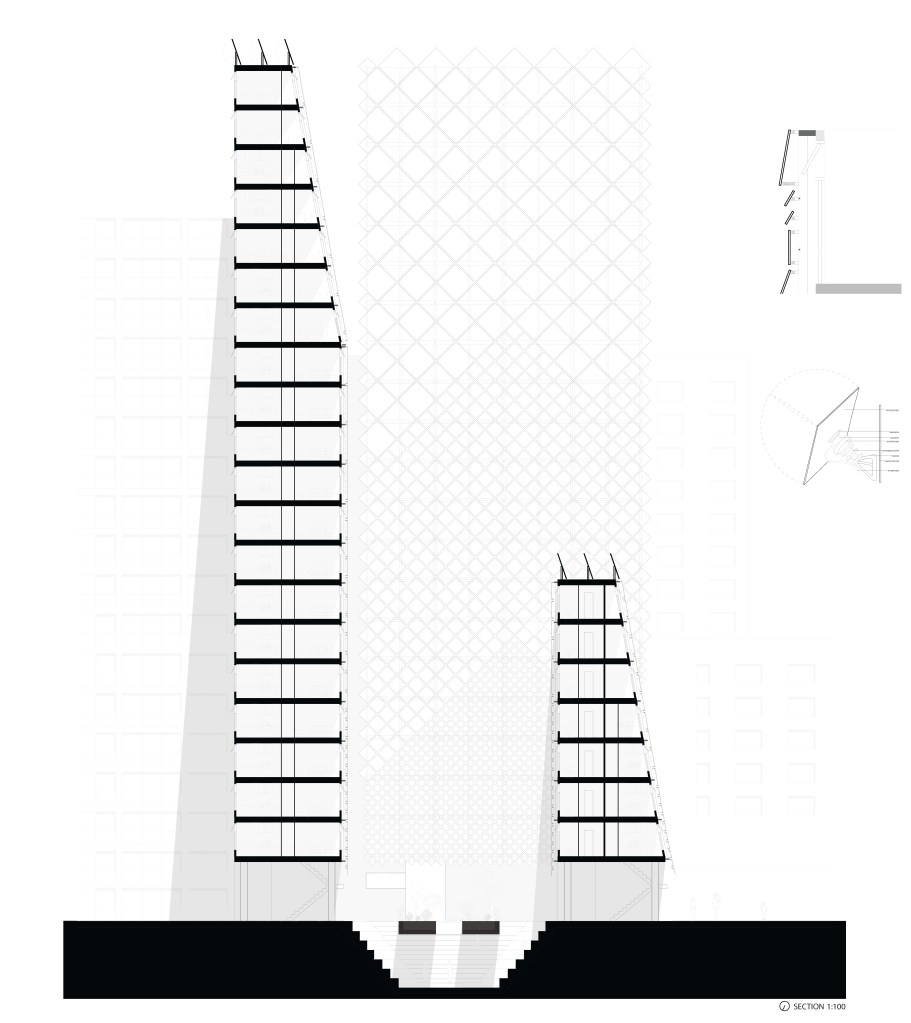 DataCentric Silos is a proposal that seeks to challenge the traditions of data centres and through its monolithic structure and lightweight skin it creates a contemporary monumentality. Through a rudimentary plan we were able to place the intricate details into areas such as passively cooling the building via awning windows, the textured interior of the voids and the polished steel plate skin.